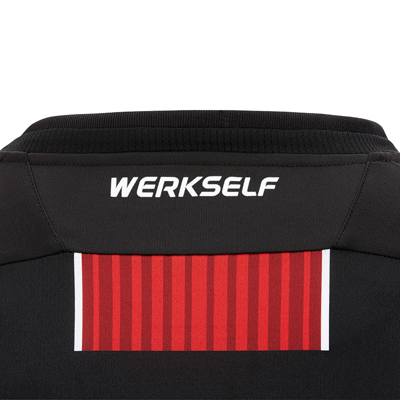 Für die Nackeninnenseite haben der Teamsportausrüster und Bayer 04 Leverkusen zusammen eine Grafik entwickelt, die das Stadion der Werkself würdigt. Sie zeigt die stilisierte Haupttribüne der BayArena mit dem Schriftzug BAYER 04 auf den Sitzschalen. Darüber ist das ikonische Runddach aus Stahlträgern symbolisiert.